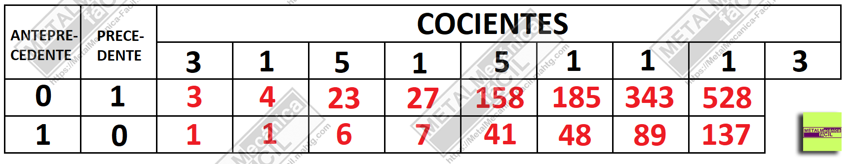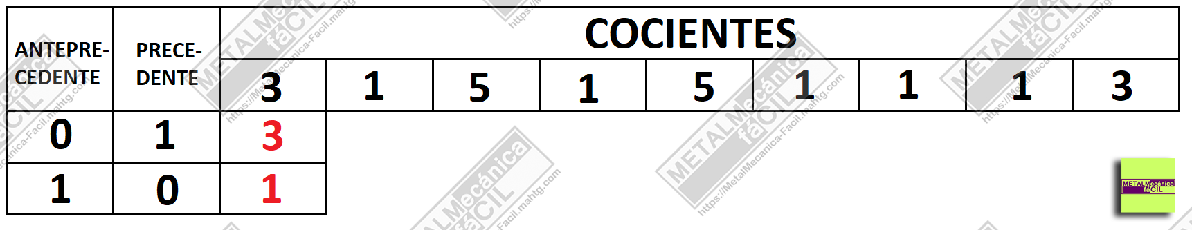 (3 X 1) + 0 = 3 este el numerador de la primer fracción reducida.