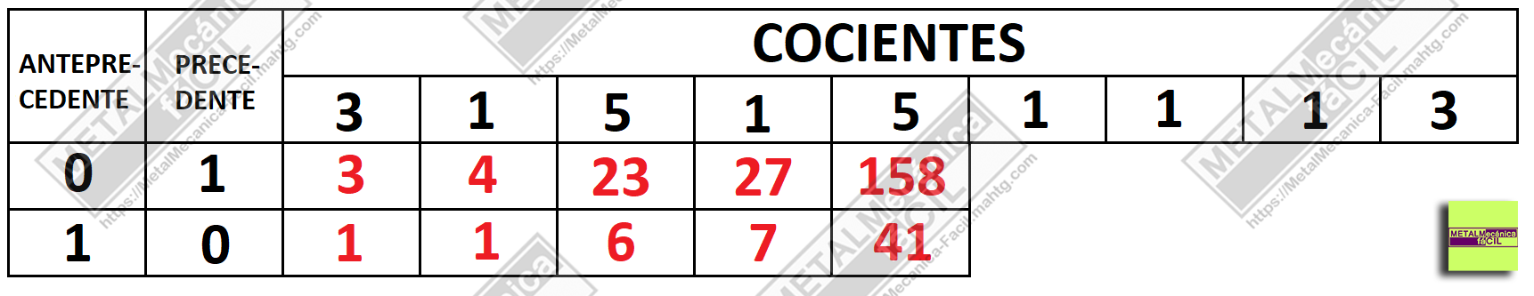 (5 X 27) + 23 = 158 este el numerador de la quinta fracción reducida.